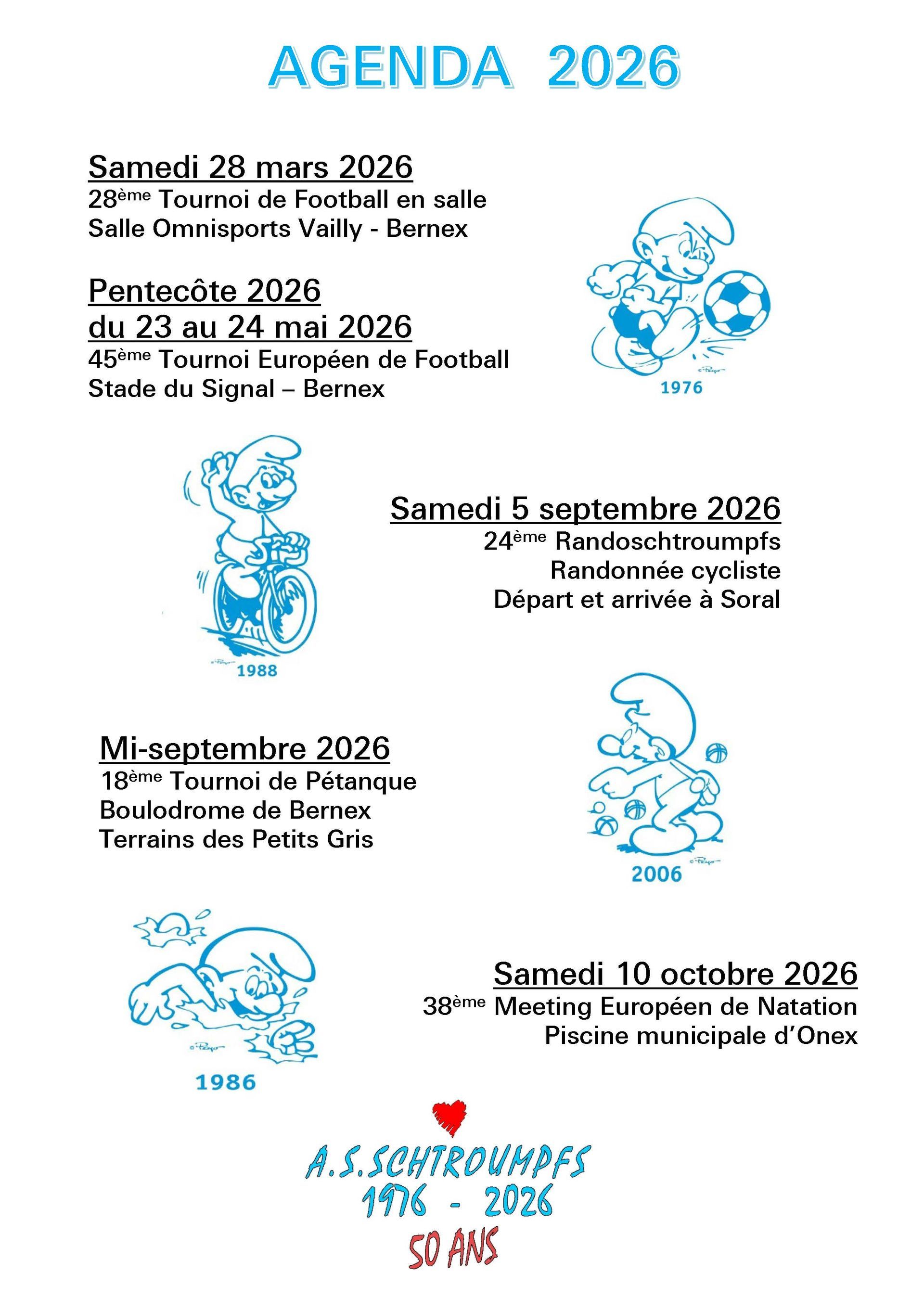 Retrouvez sur cette page toutes les informations essentielles concernant les manifestations sportives de l’année. Dates, lieux et détails pratiques seront régulièrement mis à jour pour que vous ne manquiez aucun événement organisé par l’Association Sportive Schtroumpfs.